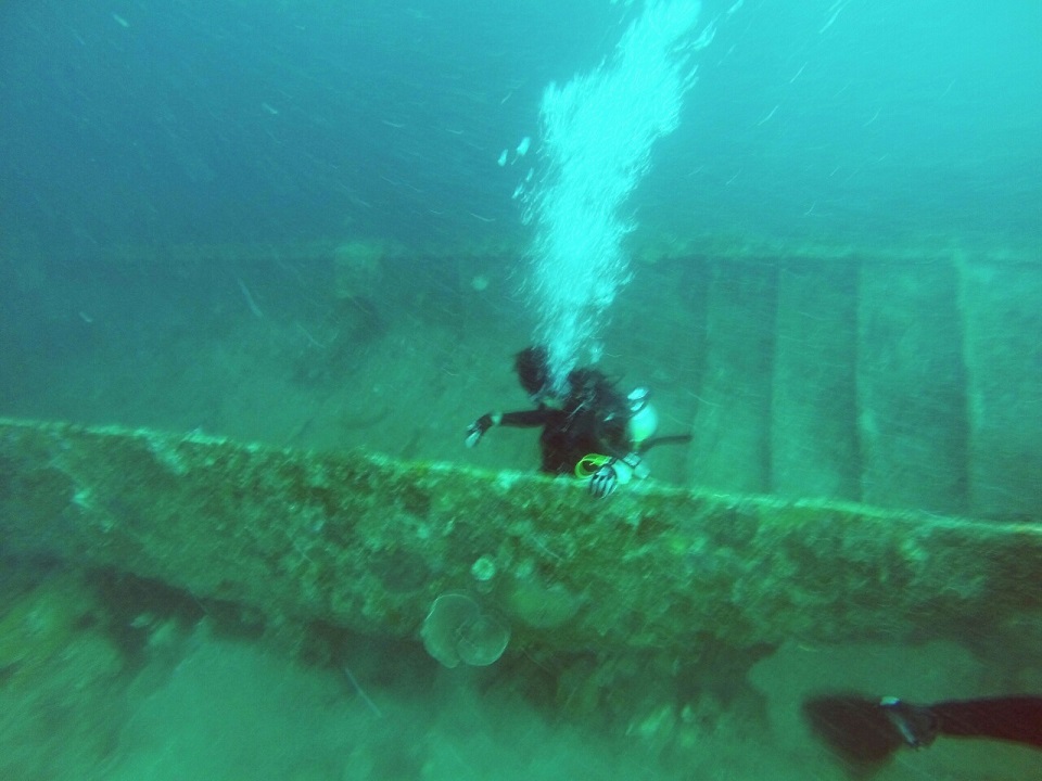 We went further down to 70 feet to a huge submerged boat. We went under the boat where there was an opening we could swim through. Mountains of hard corals and schools of fish greeted us at the other side of the opening. We were also lucky to see a young sea turtle.