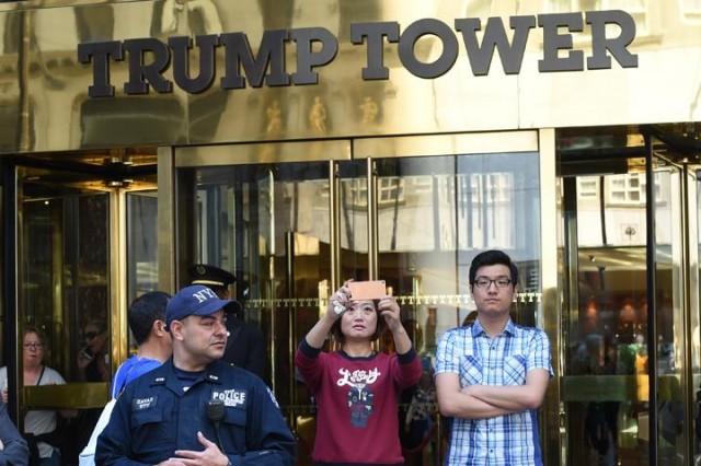 Outside, tourists posed in front of the Trump Tower sign on the facade in huge gold capital letters or next to a liveried doorman.