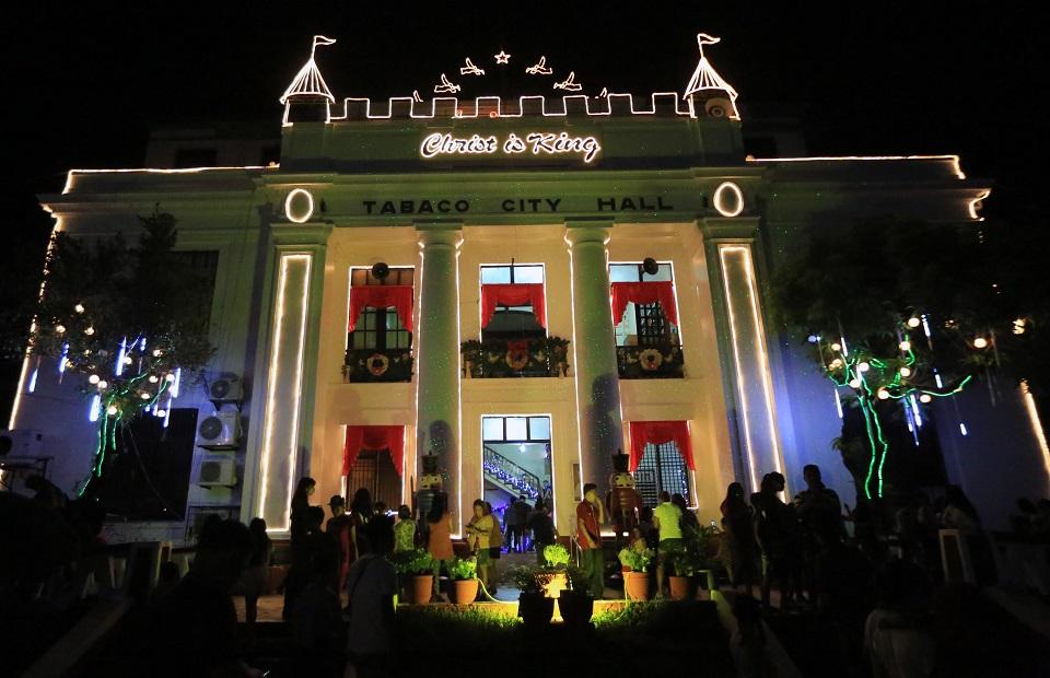 (Above) Tabaco's City Hall is lit up to look like a medieval castle for Christmas, while other decorations include (below) a Christmas tree made of presents and a Santa Claus drawn by several padyak. Photos: Danny Pata