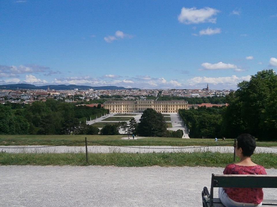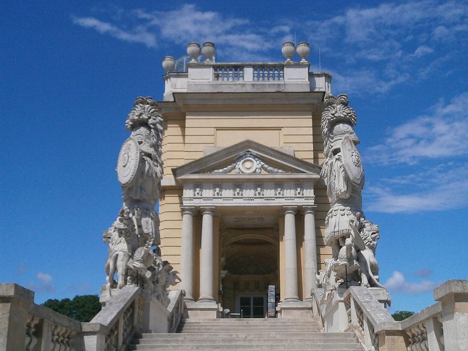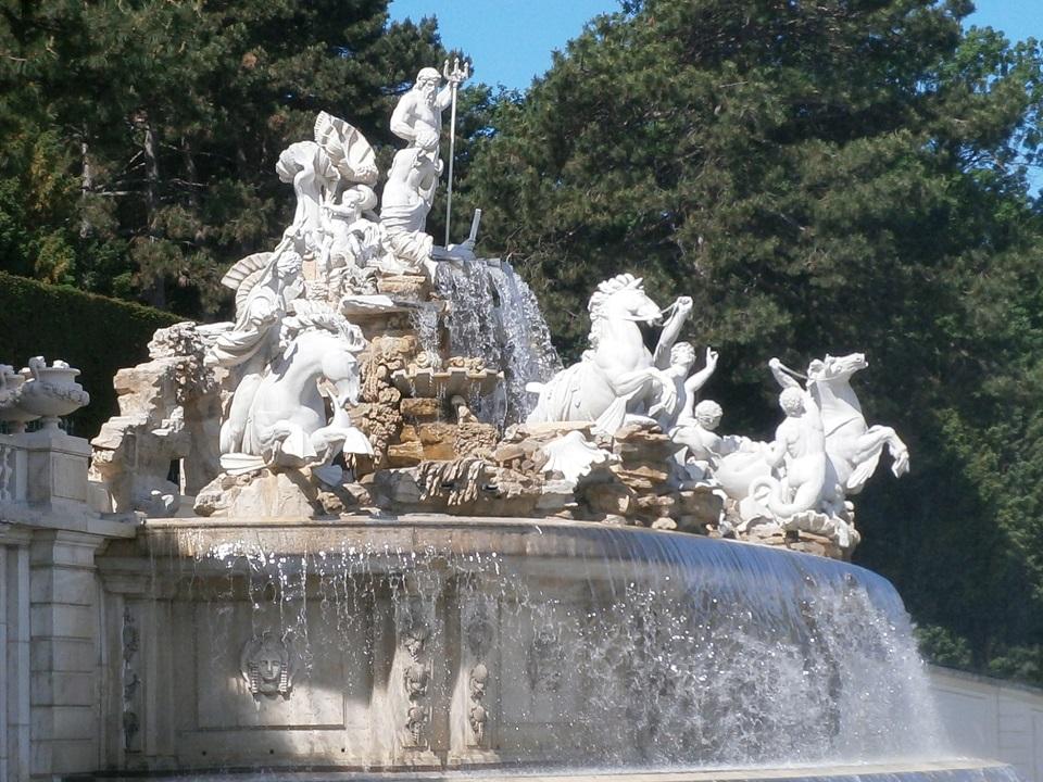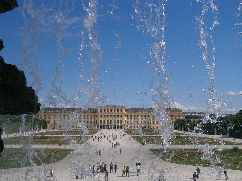 We followed this path and we reached a place at the rear where we could see the marble statues more closely, and got splashed with the cold water that bathed the figures. A large aperture in the rocks gave us a beautiful view of the Schönbrunn palace through the fountains’ water.