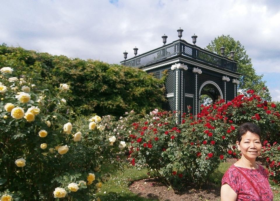 The front courtyard entrance was spacious, and many people were milling around. As we turned a corner, I saw a long wall of red blooms on climbing trellises, and when we drew near, they turned out to be masses of huge roses, their crimson color enlivening the sunlit morning. At the other side too, were yellow and peach-colored roses. A gazebo and a long green arbor provided some respite from the fierce morning sun.