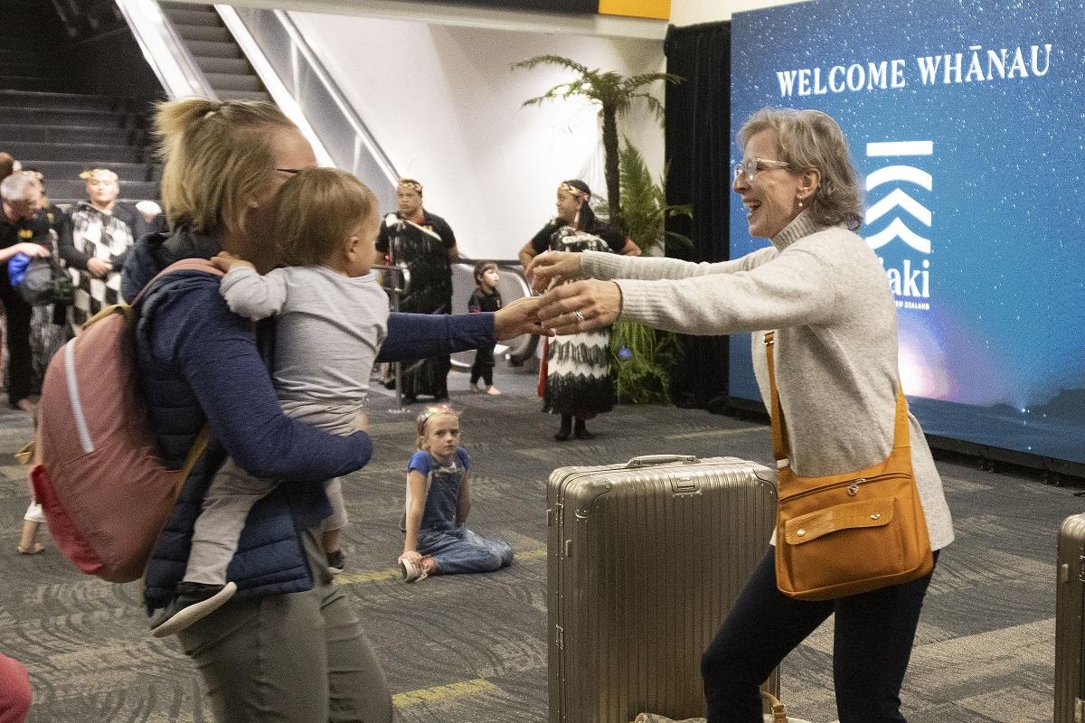 On a grass embankment at the foot of Wellington Airport's runway, the words "WELCOME WHANAU" (family) were spelled out in giant letters and Maori dancers Maori dancers performed a traditional greeting in the terminal.