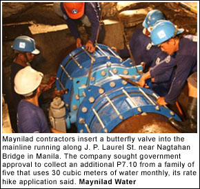MANILA, Philippines - Maynilad Water Services Inc. (MWSI), which distributes water in Metro Manilaâs west zone, sought government approval to charge higher rates. The company applied for an average increase of P11 for all its customer segments, sources knowledgeable about the matter told GMANews.TV. The petition is part of its rate rebasing exercise, a process which allows both government and the company to set its fees for the next five years. If approved, the company will collect an additional P7.10 per cubic meter of water from a family of five that uses 30 cubic meters of water monthly, documents from the Metropolitan Waterworks and Sewerage System (MWSS)-Regulatory Office show. Instead of paying P511.64 per month for 30 cubic meters of water, Maynilad customers will now be prompted to fork out P724.60 per month for their water consumption, the same documents showed. Starting this year, MWSI was allowed to charge residential clients P77.62 for the first ten cubic meters of water, P9.48 for the next ten, and P18.02 for the next 20 cubic meters of water, the companyâs website said. Excluded from these fees are charges related to currency adjustments, value added taxes, among other items. In 1997, when it secured a concession to run the Philippine capitalâs west zone, it charged its customers P4.96 for every cubic meter of water. Maynilad refused to make any announcement about its rate hike this early, a company spokesperson told GMANews.TV. âWe will be explaining details during a formal public consultation," Jennifer Casipit, the companyâs corporate communications officer said over the phone. Two public consultationsâset for November 28 and December 4âwill be held at the Clamshell exhibit near the Palacio del Gobernador in Intramuros and at Innotech along Commonwealth Avenue in Quezon City respectively. Besides Metro Manilaâs West Zoneâcovering nine cities and two municipalitiesâMaynilad also distributes water in a city and five towns in Cavite. A P1 increase translates into additional revenues worth P400 million a year for Maynilad, a source told GMANews.TV. Maynilad is owned and managed by a consortium between two publicly-listed companies, D. M. Consunji Inc. and Metro Pacific Investments Corp.