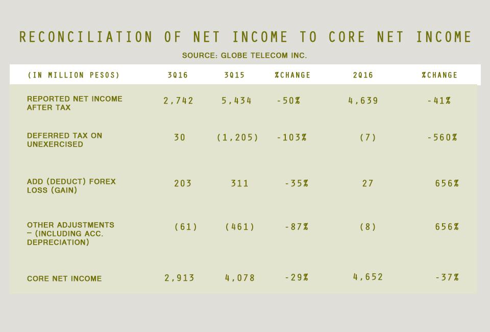 Globe's third quarter results brought the company's NIAT to P11.7 billion in January to September, down 17 percent year-on-year.