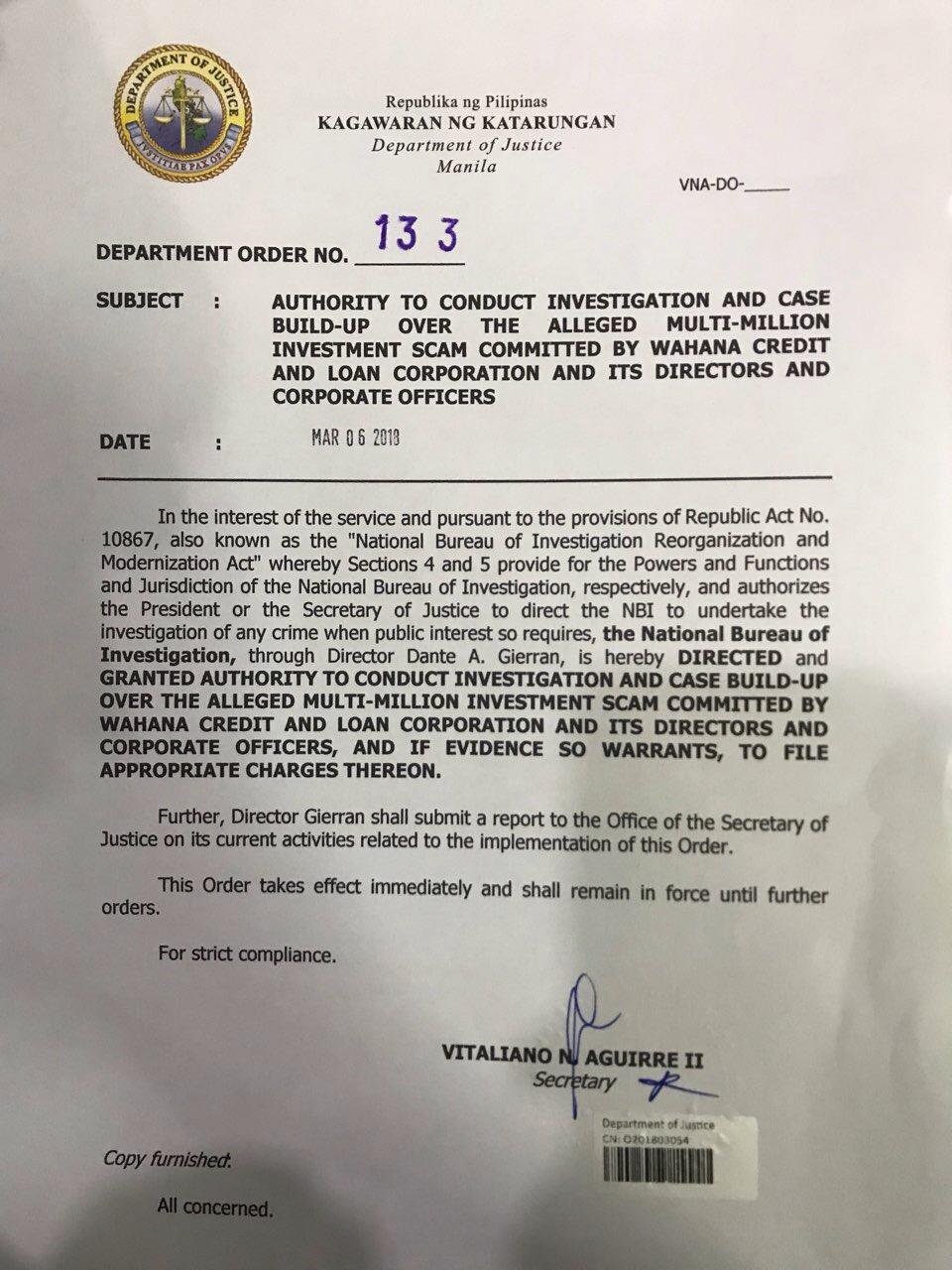 Justice Secretary Vitaliano Aguirre II directed the NBI to investigate Wahana Credit and Loan Corporation and its directors and corporate officers and, if warranted, file charges against them. His orders were contained in Department Order No. 133, which the Justice chief signed Tuesday night.