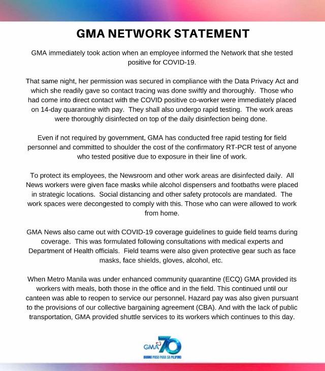 Even if not required by government, GMA has conducted free rapid testing for field personnel and committed to shoulder the cost of the confirmatory RT-PCR test of anyone who tested positive due to exposure in their line of work.