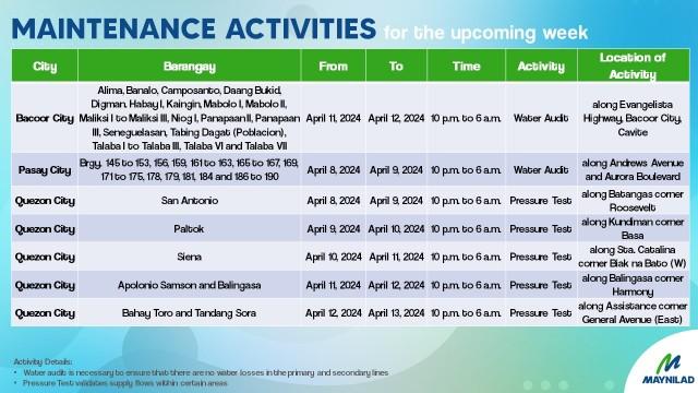 In an advisory, Manila Water said it will implement service improvement activities in the following areas from 10 p.m. on April 8, 2024 to 4 a.m. on April 9, 2024: