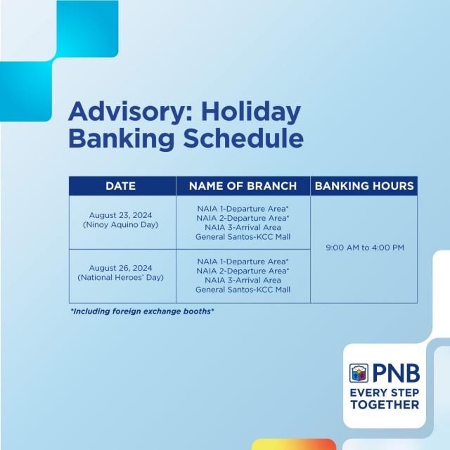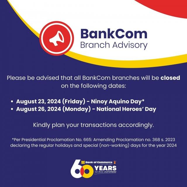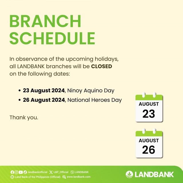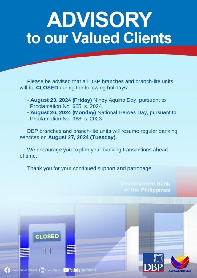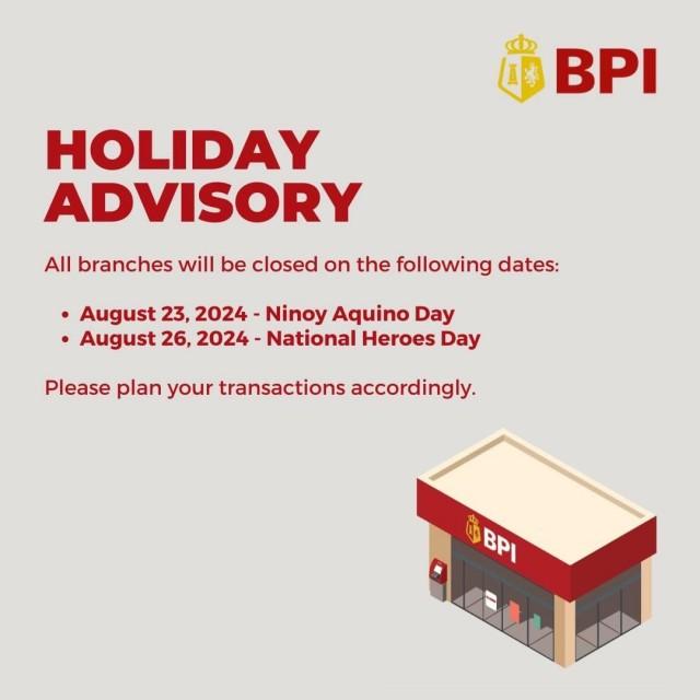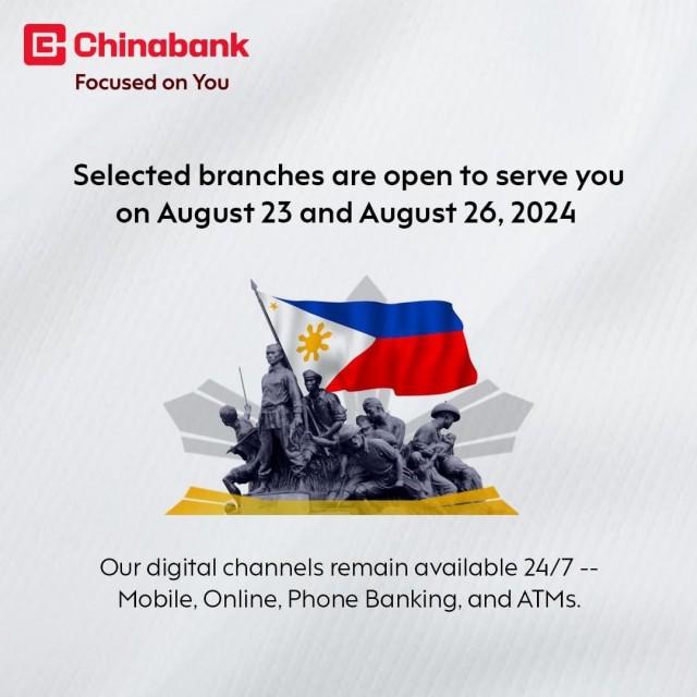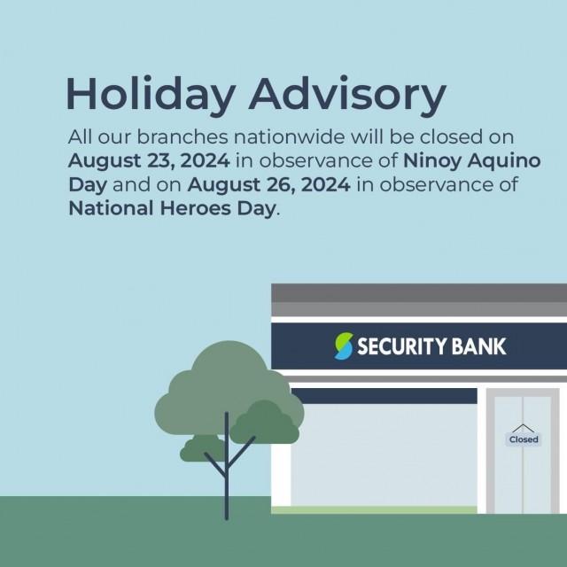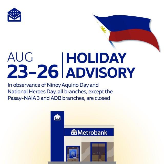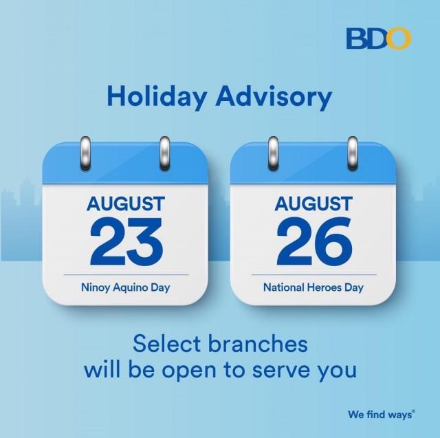 All branches are closed on Ninoy Aquino Day and National Heroes’ Day. Digital channels and ATMs will be available to cater to its clients.