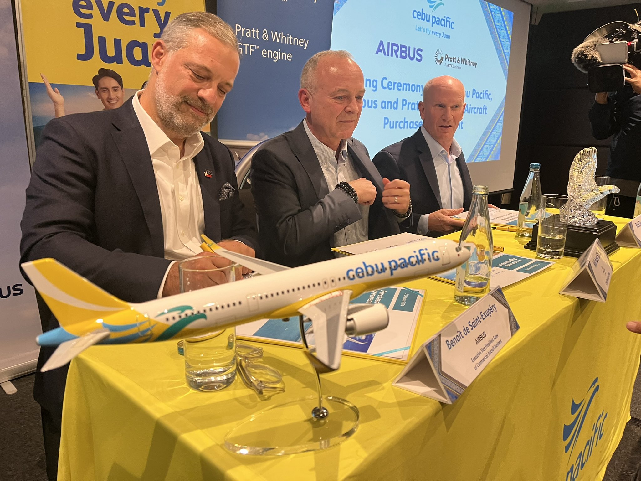 At a ceremony in Pasay City, Cebu Pacific CEO Michael Szucs, Airbus Commercial Aircraft Business executive vice president Benoît de Saint-Exupéry, and Pratt & Whitney Commercial Engines president Rick Deurloo signed the purchase deal for the airlines’ order of up to 152 aircraft, which will be powered by Pratt and Whitney engines.