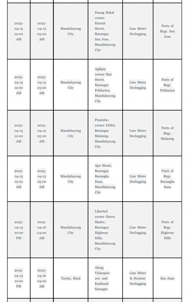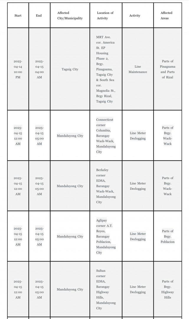 In an advisory, Maynilad said water service interruptions can be expected in Barangays Gulod, Sta. Monica, and Siena in Quezon City from 10 p.m. on Monday, April 14, until 6 a.m. on Tuesday, April 15 due to network diagnostic and leak localization
