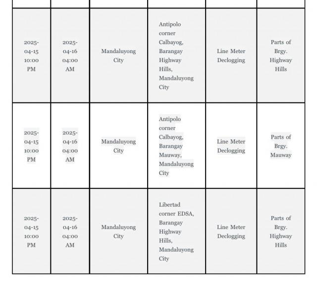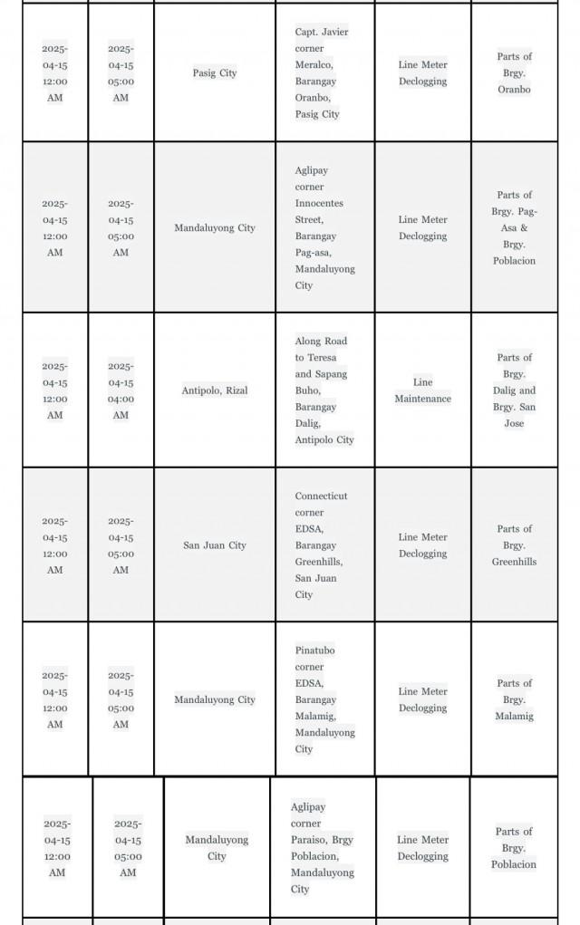 Meanwhile, Manila Water will also implement water service interruptions in the following areas: