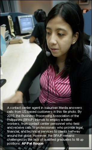 MANILA, Philippines - Local outsourcing companies may cut growth targets for next year, an indication that they may face difficulty in employing a million Filipinos and contribute nearly one-tenth of the countryâs gross domestic product (GDP) by 2010. The offshoring and outsourcing (O&O) industryâs expansion may likely decelerate given the global slowdown, said Oscar R. Sañez, chief executive officer of the Business Processing Association of the Philippines (BPA/P). The BPA/P âwill assess" its targets by the middle of the year, Sañez told GMANews.TV while at the sidelines of the launching of the Information Communications Technology (ICT) Awards-Philippines in Makati City. However, the group said it still is possible of earning revenues worth $13 billion and employing close to a million workers, as indicated by the industryâs plans. Known as Roadmap 2010, the plan formulates a strategy to maintain growth at 40 percent year until 2010 as its client base increases and companies continue to draw strength from Filipino talent, government support, and other incentives. The same plan also aims offsourcing and outsourcing to corner 8.5 percent of the gross domestic product, or the value of goods and services produced within the country. In an interview with GMANews.TV, Canadian Chamber of Commerce of the Philippines (CanCham) executive director Sean Georget said the industry is "still growing." "It might not be growing as much as we thought pre-2008 but we are still expecting most companies to be hiring. There may be some advantages in the industry in certain areas. As America and Europe are looking to cut costs, it becomes a more reliable opportunity to look at outsourcing as a way to reduce certain costs in your own business," Mr. Georget said.