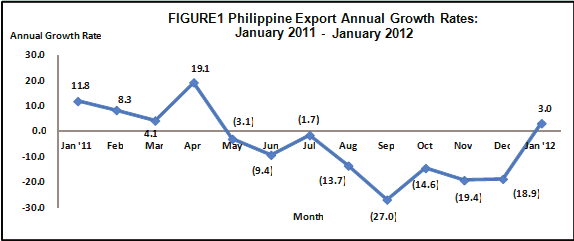 Philippine merchandise exports for January grew by 3.0 percent to $4.121 billion from $4.000 billion a year earlier, following eight months of declines since May 2011, the National Statistics Office said Tuesday. Month-on-month, merchandise export receipts went up by 21.0 percent from $3.407 billion in December 2011, NSO data showed. Electronic products were the country’s top export with total receipts of $2.152 billion, accounting for 52.2 percent of export revenues last January. Receipts from electronic products rose by 0.4 percent from $2.142 billion in January 2011. The NSO said exports of electronic products increased by 35.1 percent from $1.593 billion in the December. Receipts from the Top 10 exports reached $3.023 billion, or 73.3 percent of the total shipments.