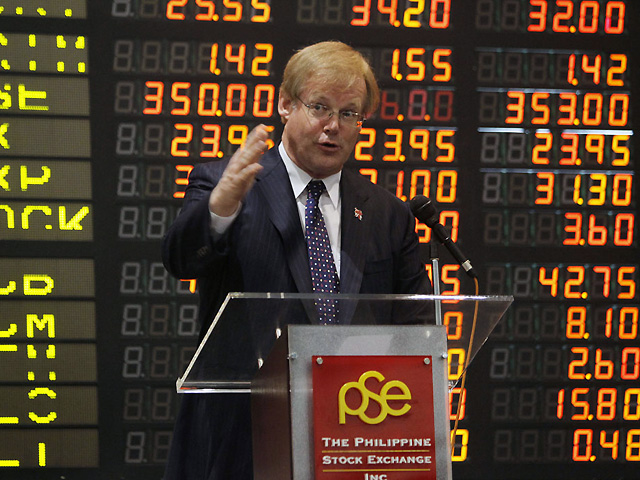 David Wootton, Lord Mayor of London, spoke at the opening of trading day at the Philippine Stock Exchange in Makati on May 21. Wootton was in Manila to lead a business mission seeking to boost partnership between Britain and the PHL. Reuters photo