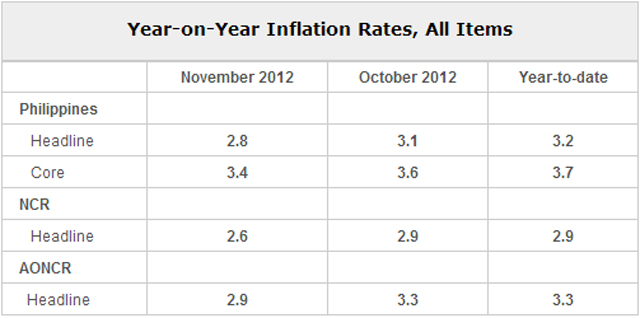 Meanwhile, core inflation – which excludes the volatile food and energy items – eased to 3.4 percent last month from 3.6 percent in October, the NSO said.