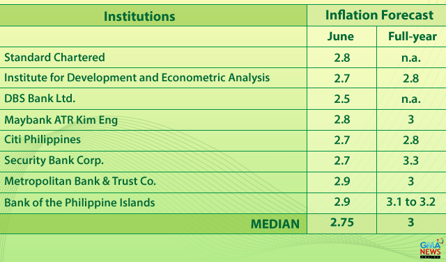The median inflation forecast of eight economists was 2.75 percent in June, within the Bangko Sentral ng Pilipinas' (BSP) 2 to 2.9 forecast for the month.
