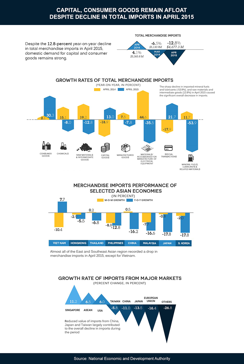 "The sharp decline in imported mineral fuels and lubricants (-53.9 percent), and raw materials and intermediate goods (-12.8 percent) in April 2015 caused the significant overall decrease in imports. However, double-digit increases were recorded in the importation of consumer (30.3 percent) and capital goods (13.0 percent)," the NEDA noted.