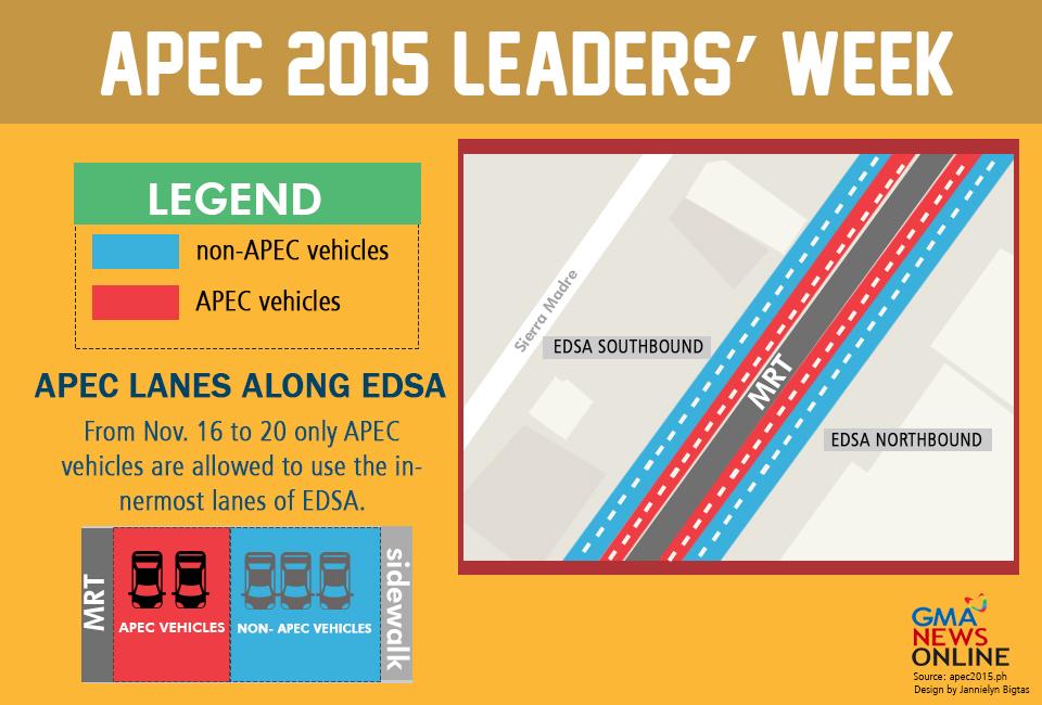 The two inner lanes of EDSA also getting cordoned off for exclusive use by APEC delegates from November 16 to 20.