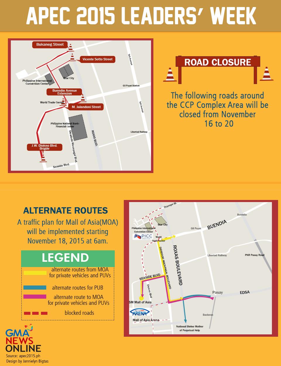 Also, roads around the Cultural Center of the Philippines Complex will be closed from November 16 to 20 and at the Mall of Asia Areana starting 6 a.m., November 18.