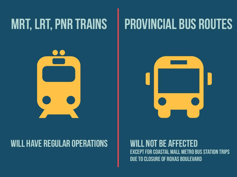 No provincial bus routes are affected by the security measures except buses going to and from the Coastal Mall Metro Bus Station with the closure of Roxas Boulevard.
