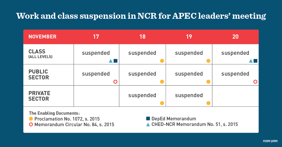 For the general public, this means no work and no school as the government declared some days from November 17 to 20 as special non-working holidays. Frontline government services will remain open.