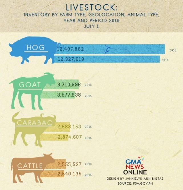 Hog inventory grew by 170,243 heads or 1.38 percent to 12.497 million from 12.327 million, goat by 33,058 or 0.89 percent to 3.710 million from 3.677 million, carabao by 13,546 or 0.47 percent to 2.888 million from 2.874 million, and cattle by 15,392 or 0.60 percent to 2.555 million from 2.540 million.