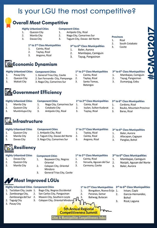 The Cities and Municipalities Competitiveness Index is an annual ranking of Philippine cities and municipalities developed by the NCC with the Regional Competitiveness Committees and the United States Agency for International Development. — Ted Cordero/VDS, GMA News