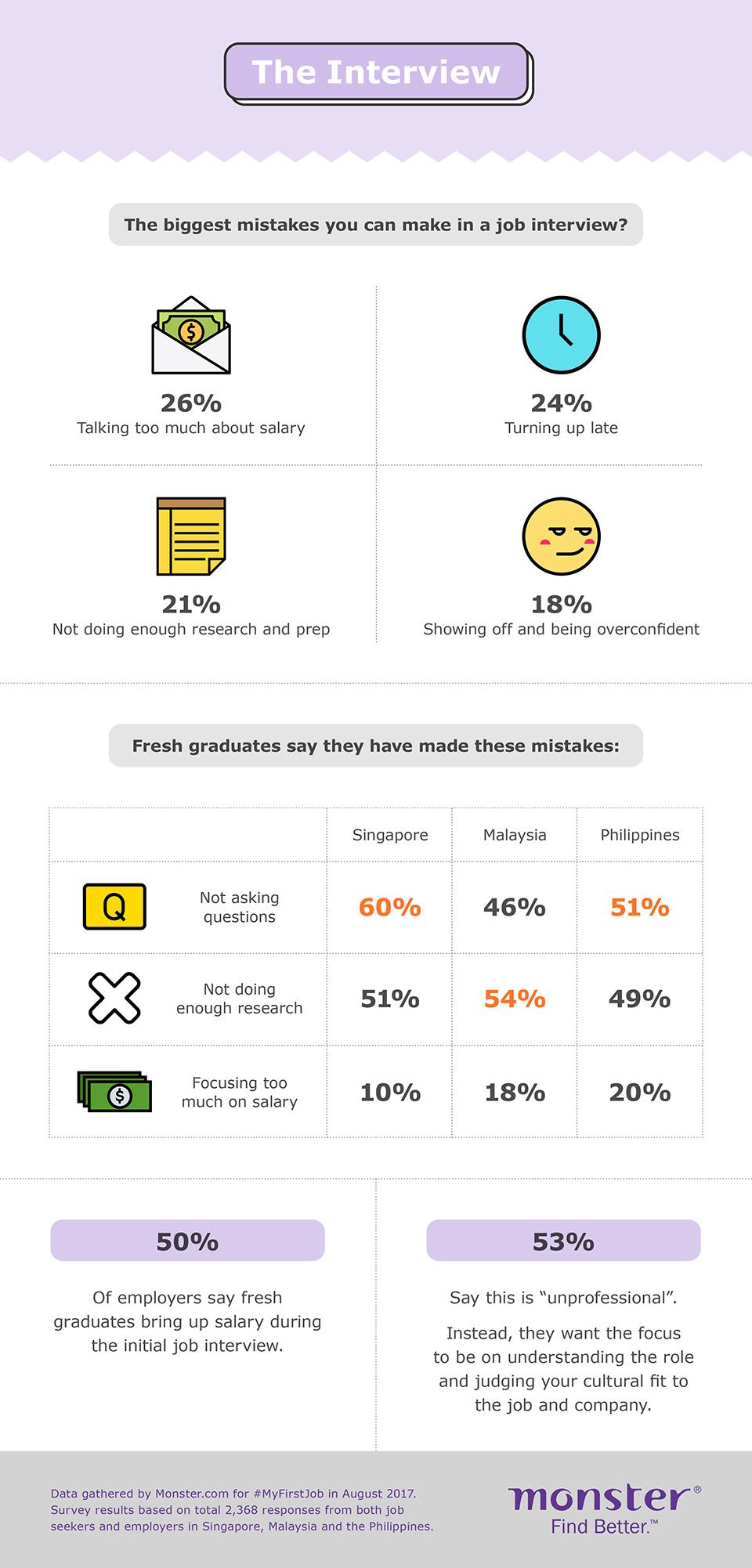 For job interview mistakes, 51 percent of fresh graduates say not asking questions is their biggest regret and 49 percent for not doing enough research on the company.