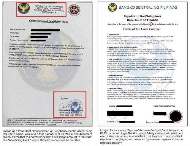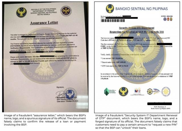In an advisory, the BSP said scammers have been circulating forged “assurance letters,” one-time password renewal requests, beneficiary bank confirmations, loan contracts, and certifications covering loans, deposits, withdrawals, fund transfers, credit cards, money changing, and investments or insurance.