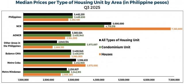 For Metro Mindanao, the median price of all housing units stood at P3,230,927 with condominium units amounting to P3,342,913 and houses at P2,989,385.