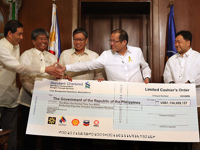 President Benigno Aquino III on Friday symbolically received a $1.1 billion check representing the government's share of the earnings of the Malampaya Deepwater Gas-to-Power project in 2011. During the handover, Aquino accepted the check for $1,134,669,157 from officials of the Malampaya joint venture project partners. “It’s a joint venture, and we have a share in the proceeds. That’s the share. It’s given every year. That’s the total for 2011. That goes to the Malampaya Fund. That’s with the DoF (Department of Finance),” Energy Secretary Jose Rene Almendras said during the turnover.