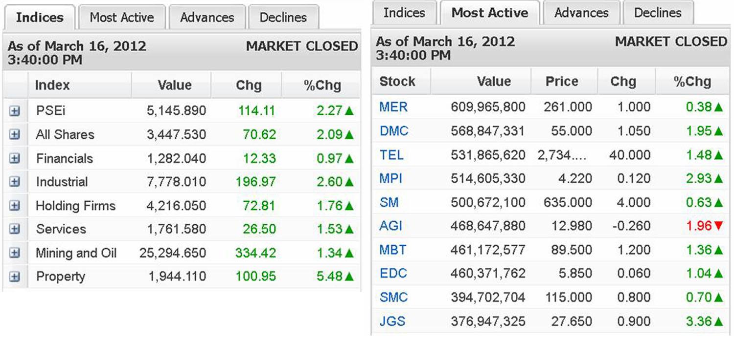 PSEi rises 2.3% to new record high of 5,145.89 points at the close of the trading week on March 16, 2012