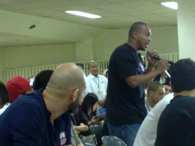 Pennisi looks on as Willie Miller of GlobalPort Batang Pier asks a question.
