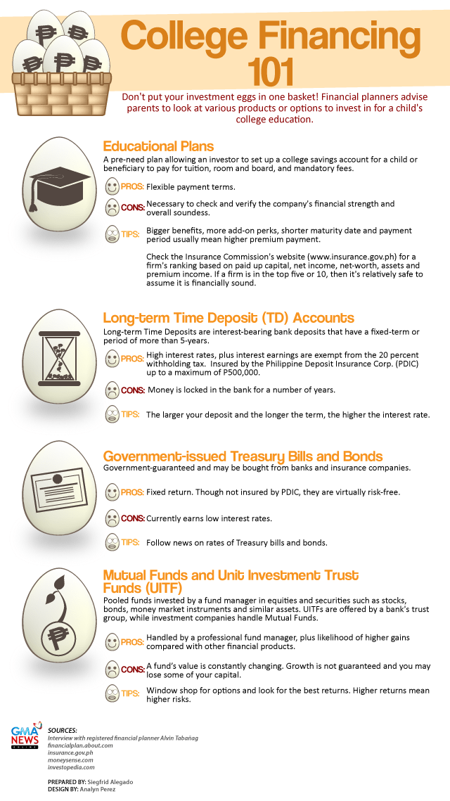 Seems nothing is certain in life except for death, taxes, and rising tuition. For some parents, tuition may strike more fear than the Grim Reaper. Professional financial planners interviewed by GMA News Online said parents should start planning for college education as early as possible, or even as soon as their child is born. Financial experts, however, said looking at other investment vehicles—like long-term time deposits at one end of the spectrum and stocks on the other—may be better to stave off the rising costs of education. Still, financial planners say it's never too late. To help parents plan for their child's college education, GMA News Online produced this infographic. This website has related articles on paying for a college education and what the government is offering to help students.