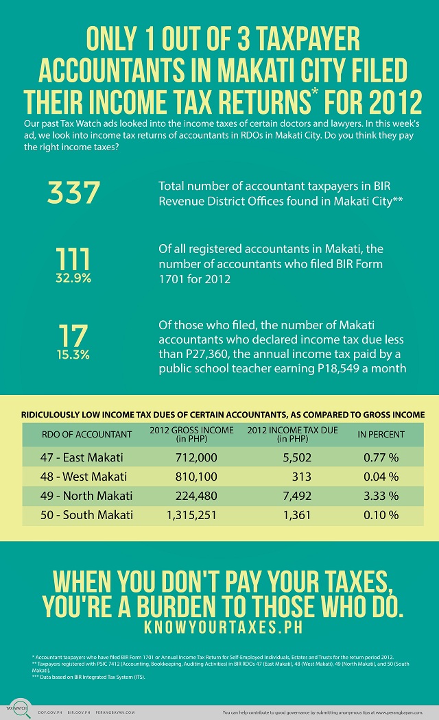 This means that – approximately – only one of every three registered accountants in Makati City has filed their income tax in 2012, the department said in an e-mailed infographic that is part of the weekly shame campaign of the BIR.