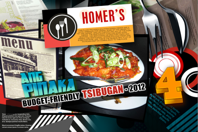 4. Homer’s Though Homer’s is actually a bar, regulars keep coming back for its sumptuous and affordable dishes. Because it is open 24 hours a day, the restaurant’s customers are mostly call center agents and media workers. Homer's serves Ilocano and Bicolano dishes such as the bicol express and dinakdakan. They also serve pizzas with uniquely Pinoy toppings like Vigan longganiza, kesong puti and tinapa. The restaurant is named after the owner’s pet dog Homer, who visits the restaurant from time to time. Drop by Homer’s at 54-A Sgt. Esguerra Street, Quezon City.