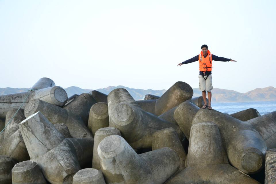 Safety first. Assistant cameraman Mong takes a break from shooting and climbs onto the wave breakers at a port on Batan Island.