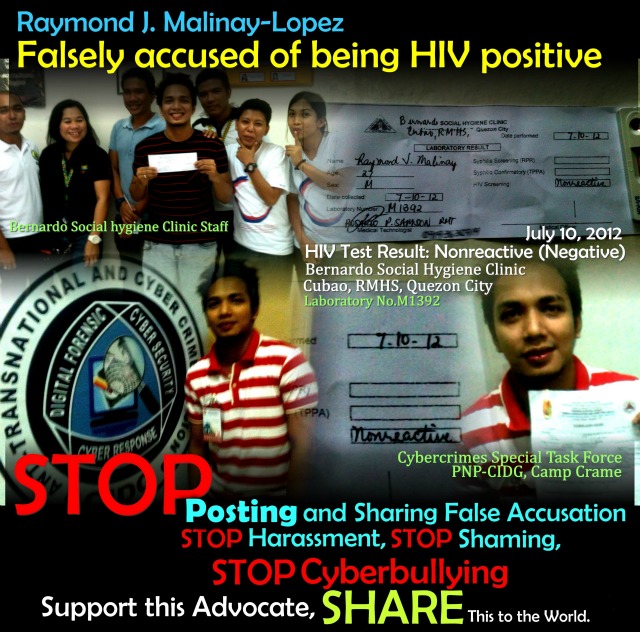 Raymond Malinay-Lopez is shown here holding a printed copy of the online poster that falsely accused him of purposely spreading the HIV virus. The poster was shared widely on Facebook. When Raymond discovered the image, he was shocked and humiliated. “What a strong accusation! I was so shocked. Everyone is calling on my mobile, hundreds of Facebook messages, phone messages, [asking] me if that's true,” said Raymond in a YouTube video that he later posted to tell his side of the story. To prove that he does not have HIV, Raymond had himself tested for at the Bernardo Social Hygiene Clinic in Quezon City and posted a copy of the negative results online. The AIDS Society of the Philippines and FEU, whose logos appeared on the original poster, also denied responsibility for the image. Raymond has since asked the Philippine National Police to investigate the incident. There are still no laws against cyberbullying in the Philippines, but this doesn't mean that victims are necessarily helpless. In an interview with Kara David for "News To Go" last March 24, social media specialist Janette Toral gave this advice to victims of cyberbullying. “Kailangan maging matapang sila at ‘wag nilang pepersonalin nang husto. Pero ‘wag pumatol. I think kapag nakaranas ka ng cyberbullying, pinaka-una mong magagawa ay i-correct yung unang misinformation,” she said. Raymond recently spoke to the GMA News TV news feature program “Brigada” about what it's like to be the target of cyberbullying and his determination to fight back: Q: Before the rumor, how active were you on Facebook? How did this change when the rumors started? I used to be very active on social media. I wanted to stay in the loop and maintain my social relationships. I was addicted to it. When the rumors started, I had to be more active because so many people were sending me messages, asking me if the rumors were true, and I had to answer them. But because of the rumors, I learned to control my activity on Facebook. Before, everything was public. Now, I made my profile private and I am more discerning when adding friends. I don’t add people unless I really know them. What was your initial reaction when the rumor first broke out? How did this affect your life at home? In school? What surprised me was that my picture had the logo of my school and the AIDS Society of the Philippines. The "posters" said that I have HIV and that I was intentionally spreading it to other people. It was a strong accusation. I was so shocked, and everyone who knew me was calling on my mobile. I received hundreds of Facebook messages and phone messages asking me if it was true. But I’m a strong person. I know that I'm innocent and I'm just a victim. It didn't affect my studies and me as a person. How did your parents and friends take the rumor? My parents and friends were disappointed, of course. They couldn’t believe that this was happening to me. They’ve always believed that I am a good person so I just kept on denying the rumors since they really are not true. They kept on reminding me to be strong. I also tried to look for a solution to my problem. How did you try to solve this problem? I decided to forward to the CIDG Cybercrime in PNP-Camp Crame copies of the images and screen grabs from those who posted and shared the false accusations, so the authorities could look into this incident and possibly file appropriate charges. I was able to give the CIDG names of those who uploaded and shared the “posters” but they told me that they can’t just file charges against them since there was no way for us to be sure if the original “posters” did come from them. It was possible that they simply shared it. But there was someone who uploaded the most number of posters. Ang magagawa na lang daw ng CIDG ay i-report itong account na ito sa Facebook. Facebook deleted the posters but those that have already been shared are actually still going around. To finally clear the issue, last July 10, I also posted a photo of a document from the Bernardo Social Hygiene Clinic in Quezon City proving that I don’t have HIV. The staff of the clinic also gamely posed for a photo with me. I also posted a statement on my Facebook account and a video on YouTube titled “Raymond J. Malinay-Lopez in False Accusation” to set things straight.