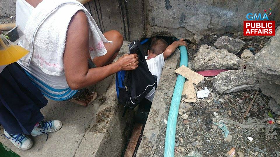 Members of a community of informal settlers in Navotas City have found a cheaper and faster route to take when they send their children to school, though it's not necessarily an easy one. Kids aged between 4 to 8 years old literally have to pass through a hole in the wall, fitting themselves in the street canal below.