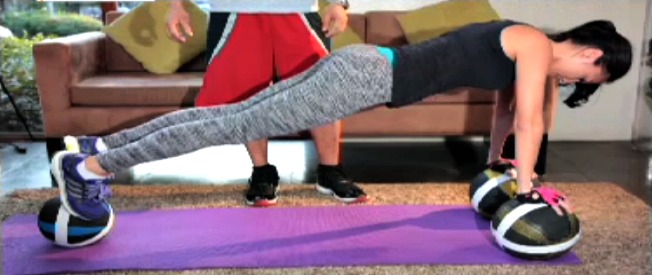 Coach John guides Solenn through this more challenging version of planking, which helps tone her core. Each hand rests on one medicine ball, while the toes of both feet rest on a single medicine ball. Keep your shoulders parallel to your hands, and your butt should not be raised.