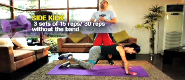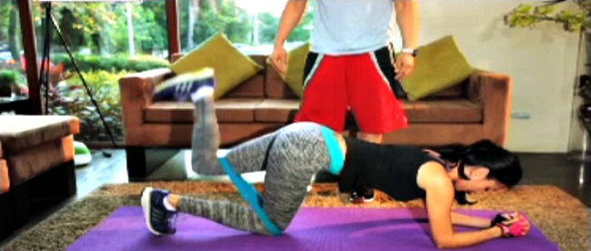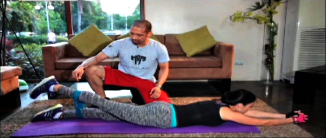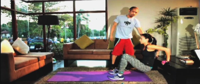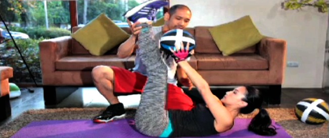 Getting started? “Sa simula pa lang dapat alam mo na ang iyong target weight at kung anong parts ng body ang kailangang i-improve,” suggests Solenn. Her workout targets the core, including the abs, arms and thighs.