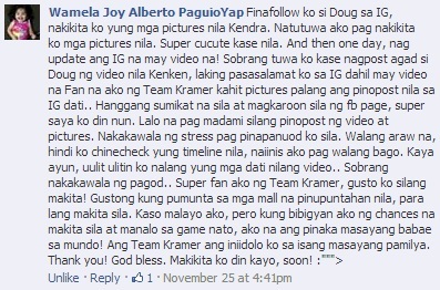 Super fan umano ng Team Kramer si Wamela Joy Paguio, kaya naman pati ang kanyang profile picture at cover photo sa Facebook at Twitter, larawan ni Scarlett ang nakalagay. Nang imbitahan siya nina Doug at Cheska sa birthday party ni Scarlett, halos hindi raw siya makapaniwala.