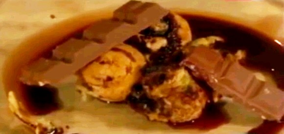 Repeat the procedure in the first recipe, but in place of squid, Japanese ginger and spring onions, add chocolate to the batter. Turn them over until the balls are brown and crispy.