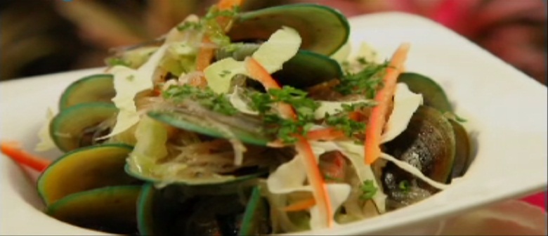 In a frying pan, saute the ginger until golden brown. Add the onions and garlic and saute for a minute. Put in the mussels. Add soy sauce and water for extra flavor. Simmer until the mussels are cooked.