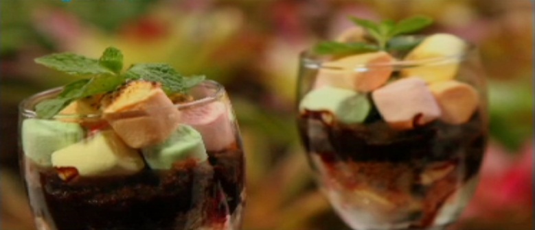 In a separate container, assemble the bananas. Add in the graham and butter mixture. Top it off with chocolate syrup and marshmallows. Serve.