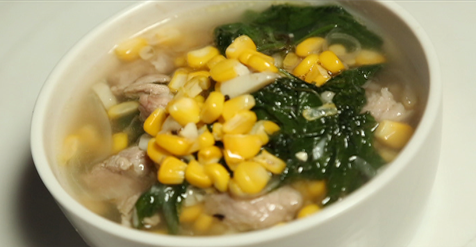 In a sauce pan, sauté garlic and onion until limp. Add in the pork, then add salt and pepper to taste. Add corn kernels. Stir cook the ingredients for 2 minutes. Pour in water or chicken stock and bring to a boil, skimming scum as it rises to top. Cover and simmer until liquid turns unclear. Turn off heat and add chili leaves, stirring to combine. Serve hot.