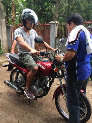 Bike instructor teaching Dennis to operate the motorcycle