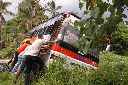 Director Adolf Alix joining the men in pushing the bus