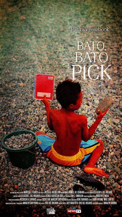 “Bato, Bato, Pick” tells the story of a family of stone pickers in La Union. Imelda and her sons Reymald, 10 years-old and Reymar, 8 years-old, work hard to pick kilos of stones to sustain their family’s daily needs. Everyday, they fight heat and exhaustion to earn only P150.00 or $3.00 per day.