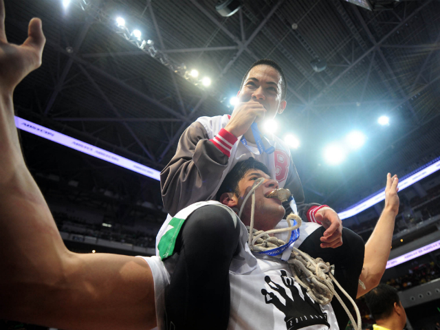 LA Revilla kisses his medal while on the shoulders of teammate Arnold Van Opstal, as the De La Salle University Green Archers celebrated being crowned men's seniors division basketball champions of UAAP Season 76 in 2013. (Photo: KC Cruz)